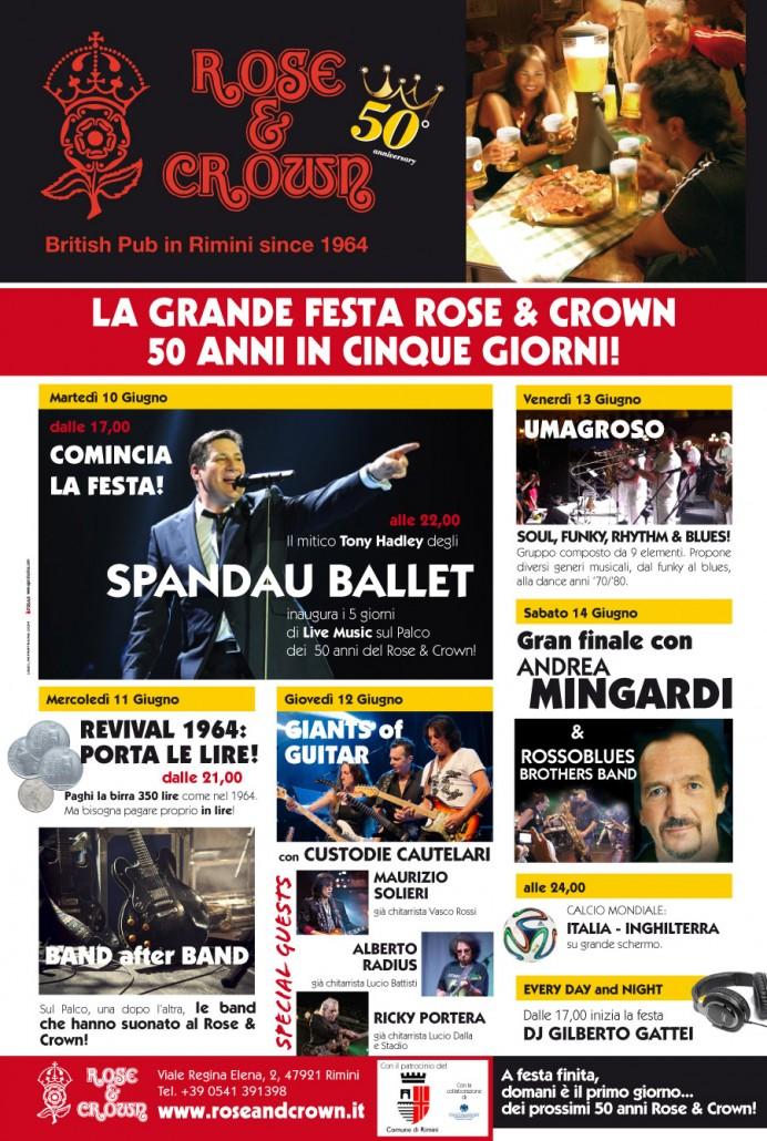 /in News /da adminIl Rose & Crown, primo pub italiano per data di fondazione, compie 50 anni, e per l’occasione il titolare Richard Di Angelo ha organizzato cinque serate di festeggiamenti, dal 10 al 14 giugno 2014, con musica dal vivo e ospiti di rilevo internazionale: Tony Hadley degli SPANDAU BALLET, i “Gigants of guitar”, gli Umagroso, Andrea Mingardi. e tutte le band che hanno suonato nel pub dagli anni ’60 ad oggi. PIRAS ha realizzato il logo del cinquantennio e tutta la comunicazione dell’evento.