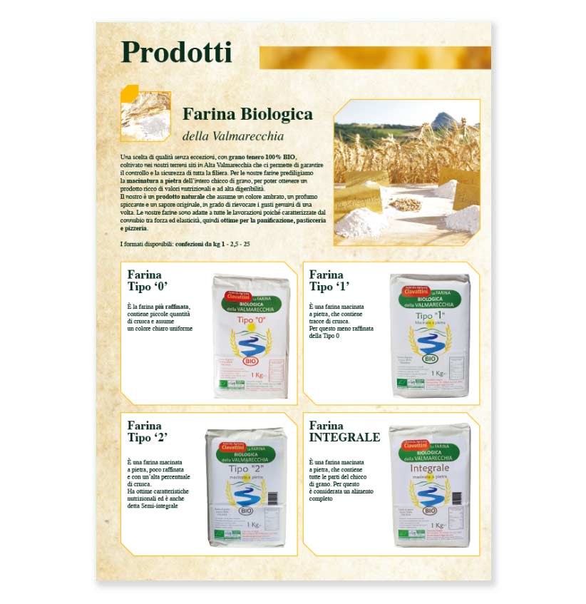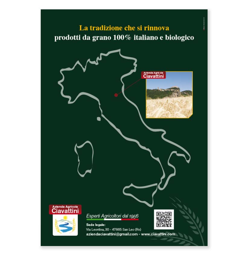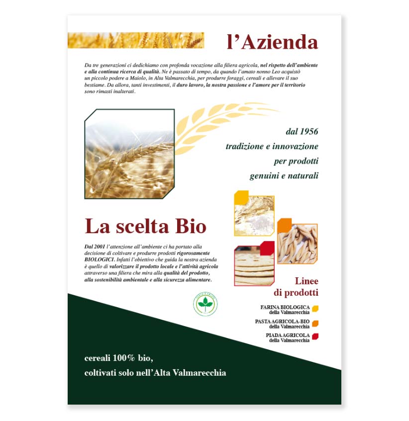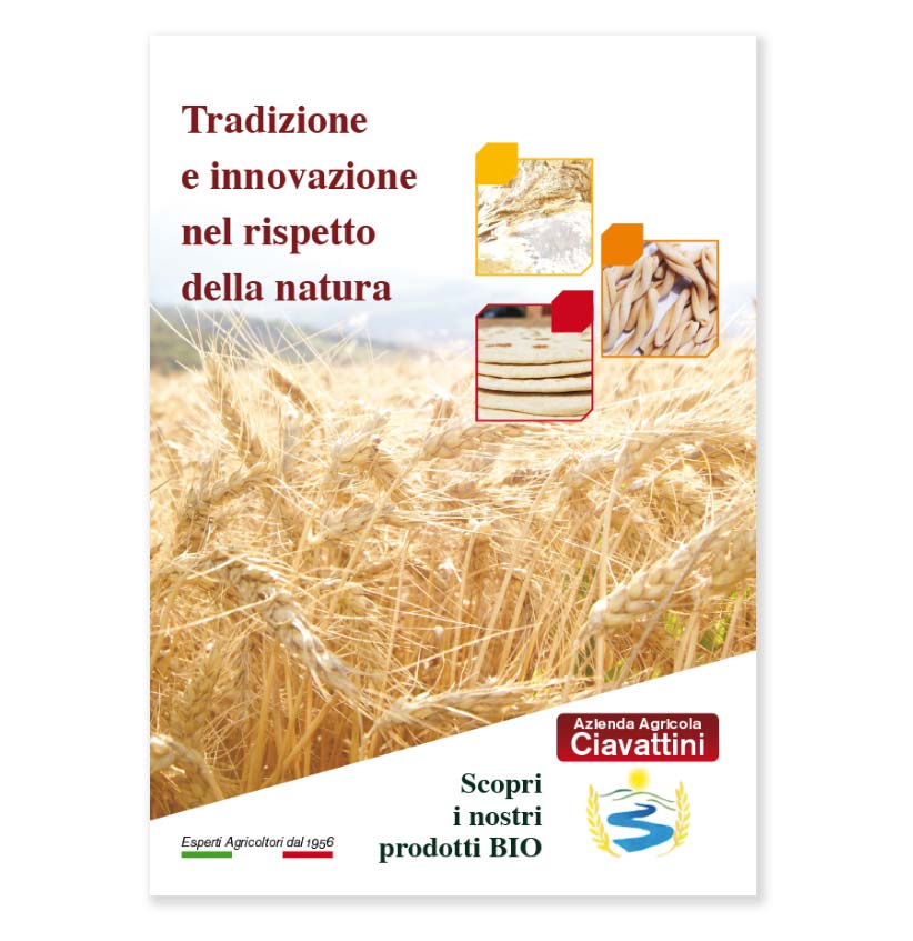 L’azienda Agricola Ciavattini in Alta Valmarecchia, coltiva e produce prodotti ottenuti da grani rigorosamente BIOLOGICI. L’obiettivo che guida l’azienda è quello di valorizzare il prodotto locale e l’attività agricola attraverso una filiera che mira alla qualità del prodotto, alla sostenibilità ambientale e alla sicurezza alimentare. Abbiamo ideato e creato una brochure / catalogo rivolta ai gestori dei punti vendita e supermercati locali, che illustri i prodotti e le caratteristiche assegnandoli un valore aggiunto e una immagine di alimento naturale, ecologico, biologico e a km zero.
