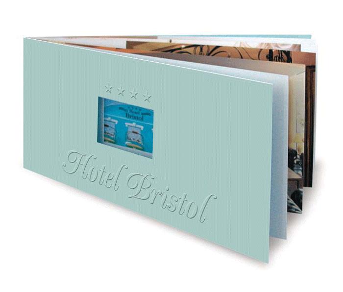La brochure è insieme classica e frizzante, in sintonia con l’immagine che si vuole trasmettere dell’hotel di qualità superiore. Grandi foto, grafica sobria, e una fustella sulla copertina in cartoncino metallizzato e satinato con stampa a rilievo del marchio dell’hotel 4 stelle, una finestra che svela il contenuto interno.