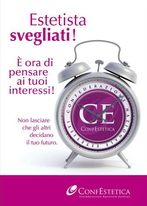 Colore acceso di fondo, richiamo immediato al brand istituzionale; un potente visual che propone una sveglia con il marchio Confestetica accompagnato da un copy incisivo “Estetista Svegliati! è ora di pensare ai tuoi interessi. Non lasciare che glia altri decidano il tuo futuro”; head line per promuovere i vantaggi e i benefit che si ottengono all’adesione all’associazione, per uno stand ficcante ed efficace.