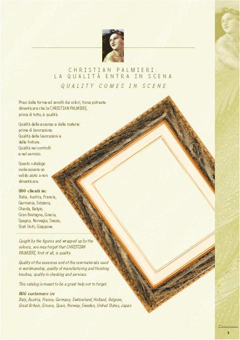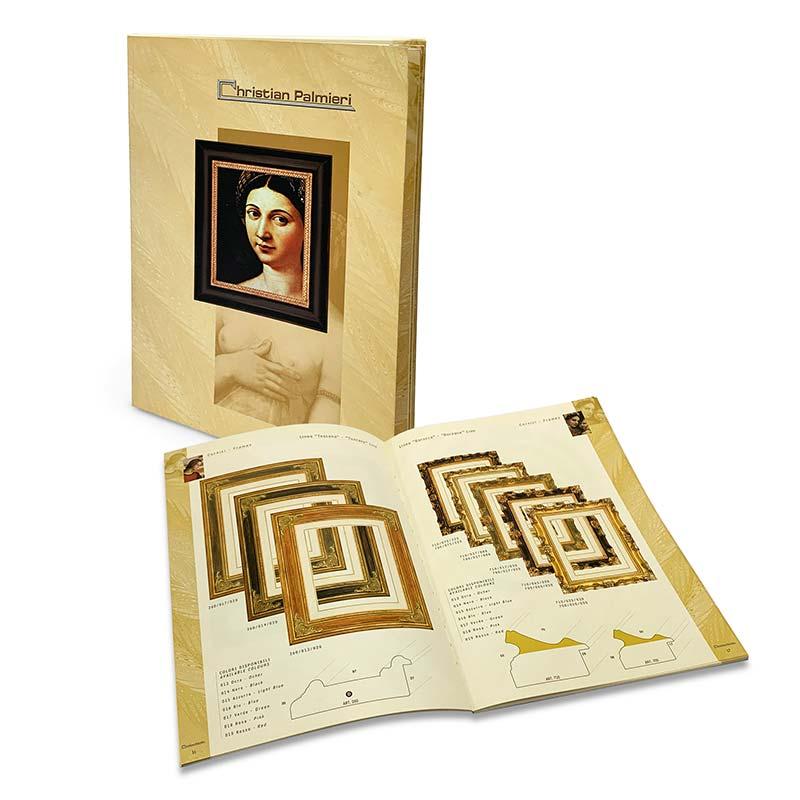 In copertina, il valore del prodotto è espresso dall’immagine: il dipinto ha la sua piena visibilità cromatica soltanto all’interno della cornice. L’impaginato riporta le varie tipologie di cornici abbinandole a dettagli di dipinti, in una grafica elegante e discreta, che valorizza ogni prodotto rappresentato.