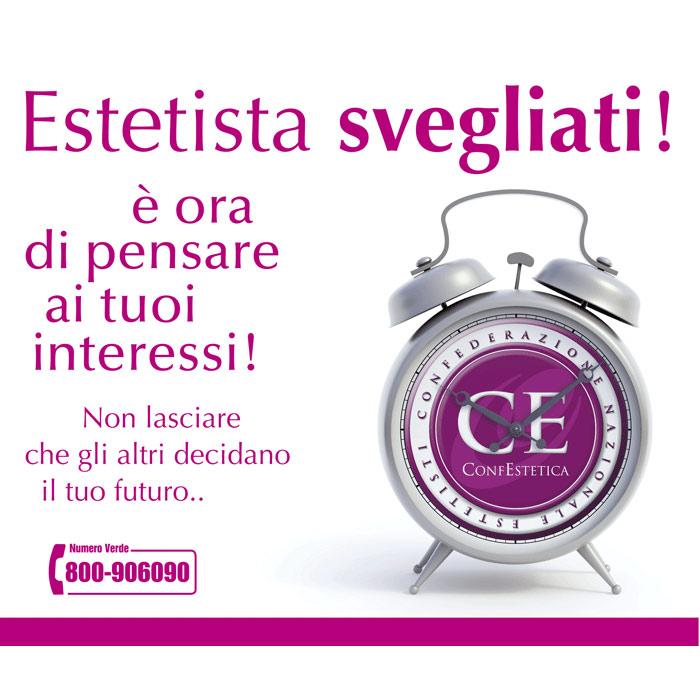 Ideazione creativa e realizzazione esecutivi dello stand Cosmoprof di Bologna. Colore acceso di fondo, richiamo immediato al brand istituzionale; un potente visual che propone una sveglia con il marchio Confestetica accompagnato da un copy incisivo “Estetista Svegliati! è ora di pensare ai tuoi interessi. Non lasciare che glia altri decidano il tuo futuro”; head line per promuovere i vantaggi e i benefit che si ottengono all’adesione all’associazione, per uno stand ficcante ed efficace.