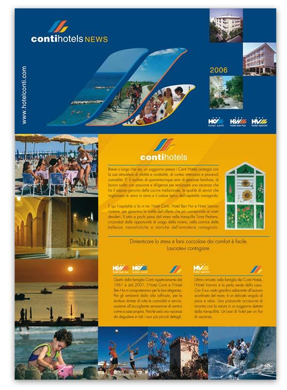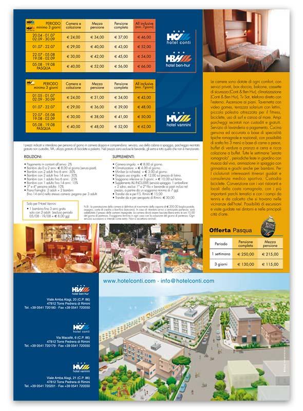Dépliant pieghevole / news letter con la copertina che svela parte del contenuto interno: servizi, opportunità, listino offerte speciali e tutte le informazioni per godersi la vacanza presso la struttura alberghiera sul litorale di Torre Pedrera di Rimini. In copertina il segno grafico distintivo richiamo immediato al brand della catena alberghiera che gestisce tre hotel: H. Conti, H. Vannini e H. Ben Hur; le tre onde diventano finestre per ospitare foto che suggeriscono momenti della vacanza come spiaggia, mare, escursioni ciclistiche nell’entroterra.