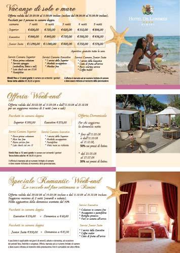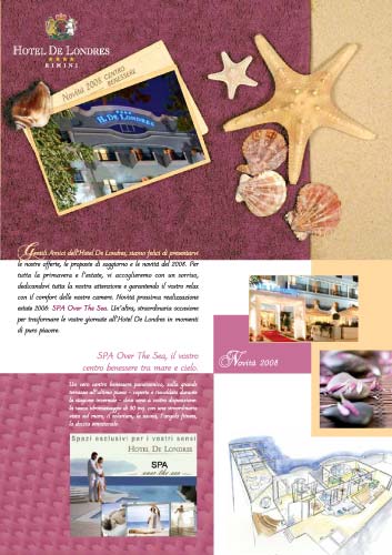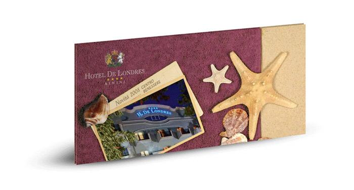 Dépliant sfogliabile per il prestigioso Hotel De Londres quattro stelle di Marina Centro di Rimini. Grafica avvolgente, caratteri tipografici classici con grazie e svolazzi, colori pastello dalle tonalità calde che propongono fondini di pareti con pitture spugnate e materiche dal gusto un po’ retrò, carta da parati, oggetti di arredo, close up su dettagli di oggetti per rappresentare lo stile e dare un mood accogliente alla struttura alberghiera di eccellenza.