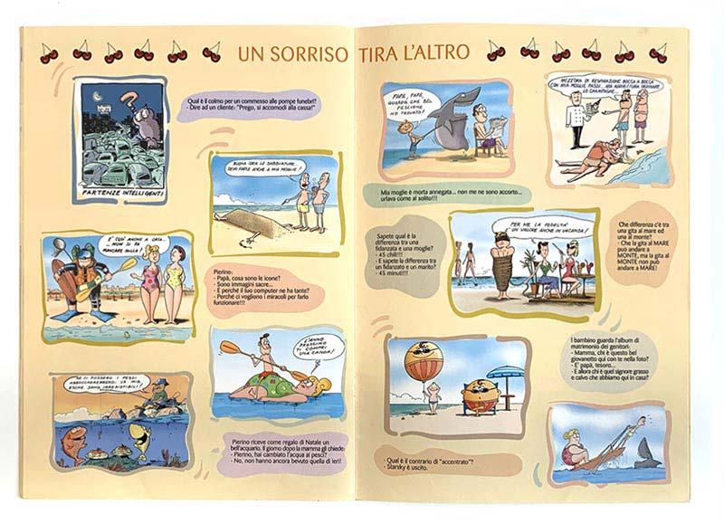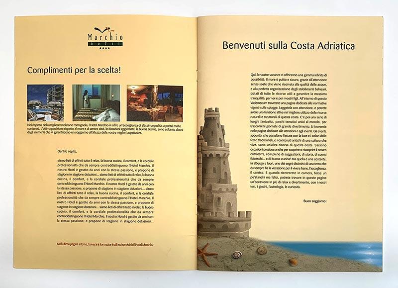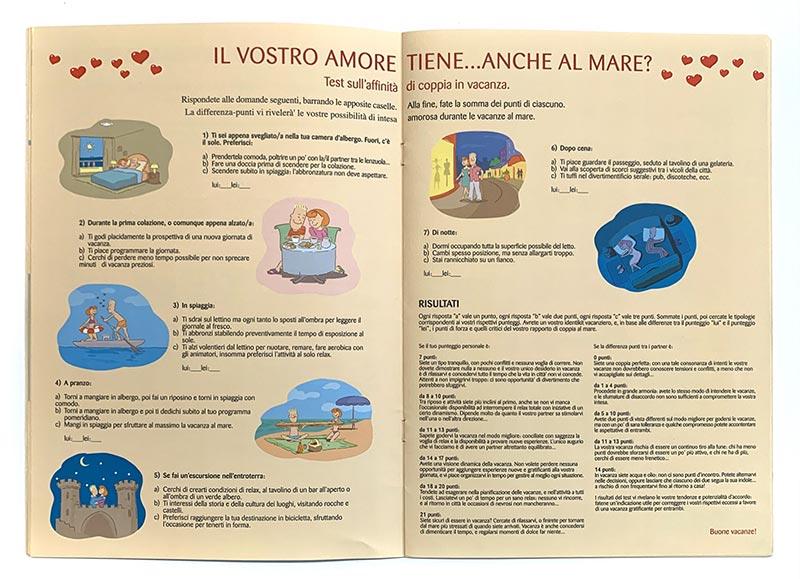 Immagini / illustrazioni “minimali” realizzate in occasione della progettazione di vademecum / guida alle vacanze. Dalla narrazione umoristica della storia di Paolo e Francesca e del castello di Gradara, ai giochi, alle barzelletta da spiaggia e tante informazioni utili per godersi appieno la vacanza in riviera. Uno strumento originale e utile, realizzato con illustrazioni semplici e gestuali, un po’ infantili e pensate anche per i bambini, la comunicazione immediata spesso aiutata da fumetti per uno strumento gratuito, distribuito presso gli alberghi riminesi.