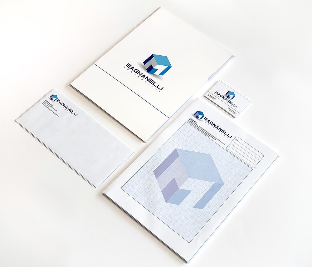 Il marchio si sviluppa su un cubo – figura geometrica che evoca solidità e stabilità – sulle cui facce sono espressi due segni grafici, che visti in prospettiva, disegnano una M. Il logotipo MAGNANELLI e il payoff sono ottenuti con un carattere tipografico bastone squadrato, essenziale e geometrico, anch’esso evoca pulizia e solidità. Al marchio / logotipo seguono i vari strumenti di comunicazione (cartellina, blocco appunti, busta e biglietto da visita, ecc.) che creano una comunicazione integrata di impresa e primo passo per una Corporate Identity.