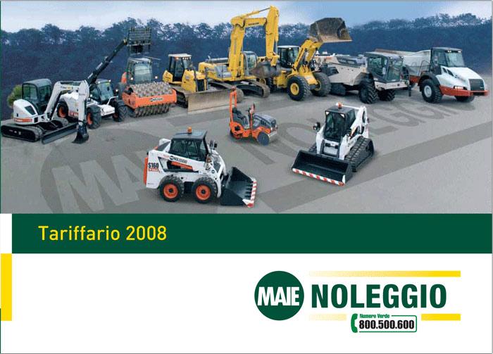 Dépliant sfogliabile che presenta tutte le opportunità del noleggio dei vari modelli e delle attrezzature e listino / tariffario delle macchine movimento terra, stradali e impianti di frantumazione dei prestigiosi marchi come Bobcat, Fiat Hitachi, Wirtgen, distribuiti da Maie. Formato pratico e maneggevole, grafica decisa asciutta con i colori, verde scuro e giallo squillante, istituzionali del logo MAIE per dare continuità alla comunicazione e creare un’immagine coordinata e una corpore identity.