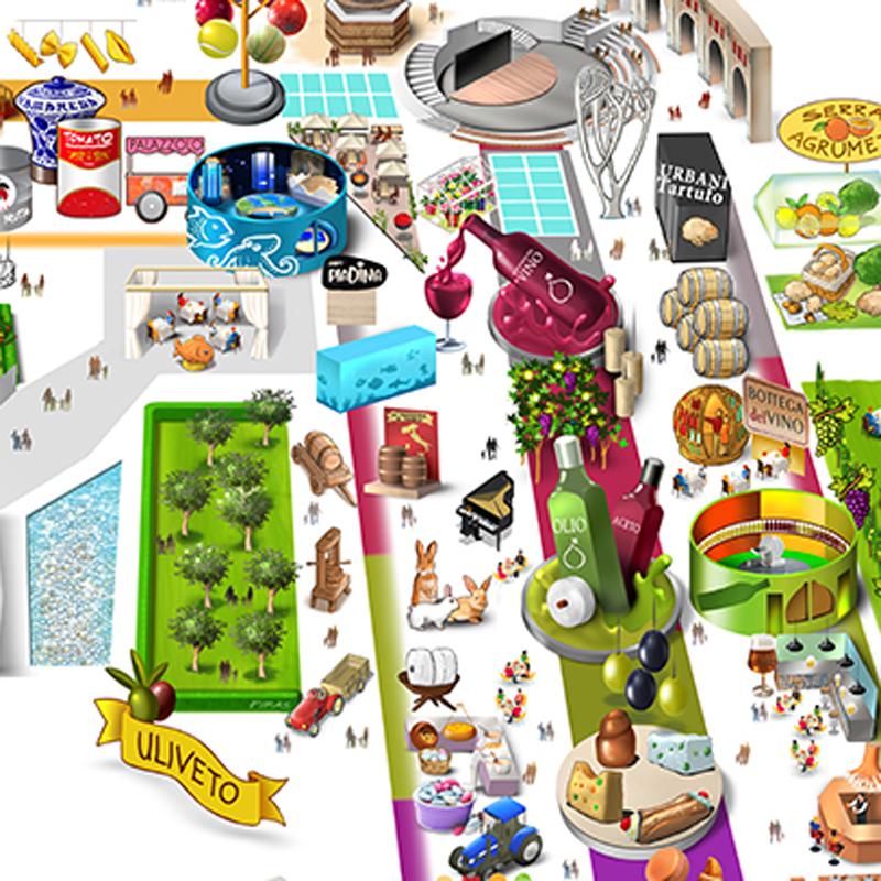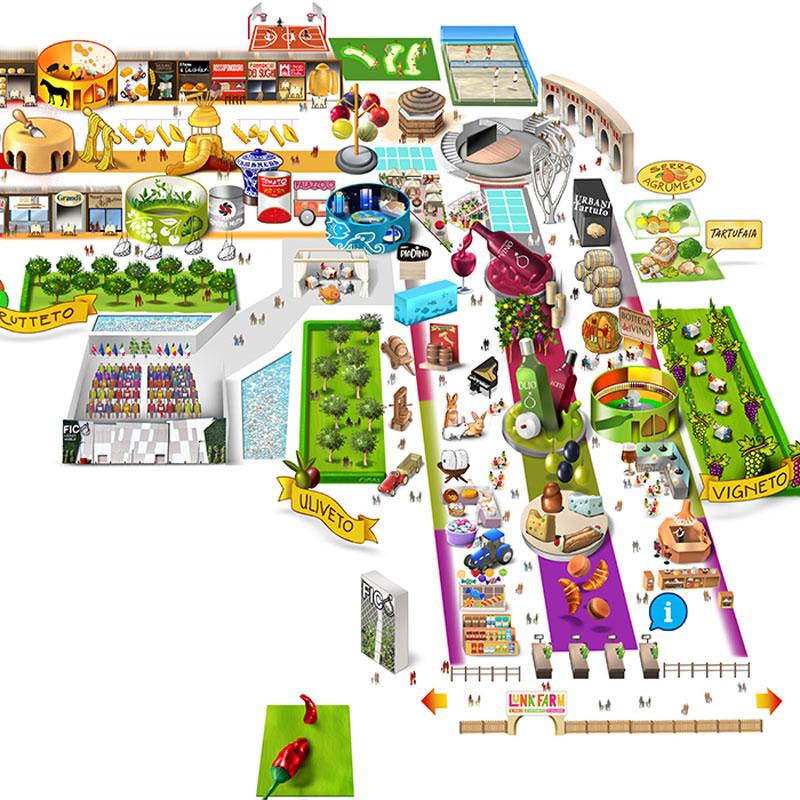 Briefing: Ideazione e realizzazione della mappa illustrata per il FICO EATALY WORLD, il più grande parco tematico dedicato al settore agroalimentare e alla gastronomia del mondo. L’aggiornamento della piantina realizzata nel 2017 ha richiesto una ulteriore stilizzazione e inserimento di nuove attività. all’edizione 2021 con nuovi stand e le nuove postazioni. Rispetto alla mappa realizzata precedentemente, l’ufficio marketing del parco manifesta l’esigenza di una piantina più sintetica e immediata, dove far emergere immediatamente i punti di interesse e le strutture più caratteristiche del parco tematico ma senza perdere in leggibilità. Punto di partenza fondamentale per la realizzazione di una mappa illustrata è fare un sopralluogo per prendere visione di tutti i punti di interesse. Ridisegnarli opportunamente visibili e in alcuni casi stilizzandone sia l’aspetto che la loro dimensione nel contesto, diventa un requisito importante tenendo conto della dimensione ridotta della stampa di un volantino. In sintesi, agevolare la leggibilità da parte del visitatore affinché si orienti trovando le attrazioni e i punti di interesse illustrati.