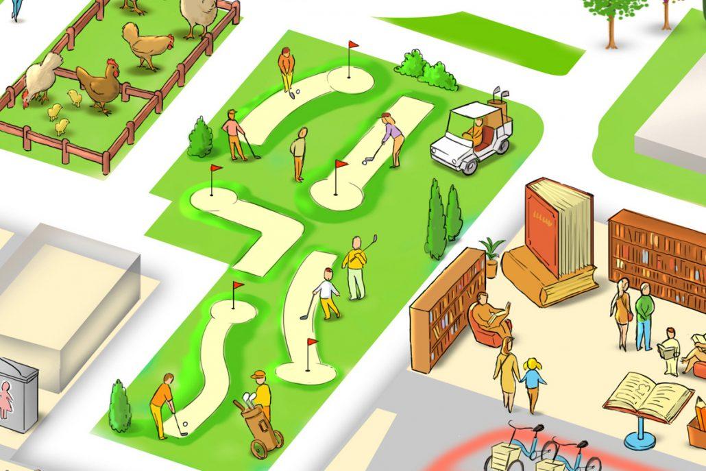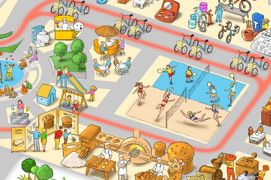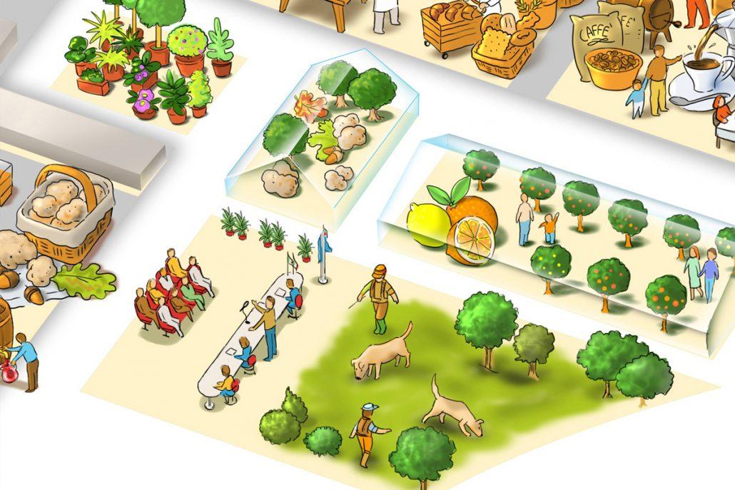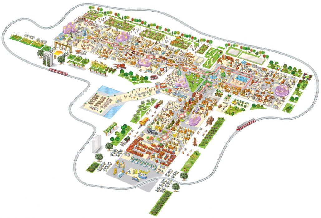 La piantina illustrata nasce con l’obiettivo di creare una illustrazione che rappresenti e orienti i visitatori tra le molteplici attrazioni, operatori, punti di interesse offerti dal parco e che possa rappresentare l’intera struttura un’unica immagine che la sintetizzi in un colpo d’occhio. E’ stata falsata la scala di molti particolare per creare immagini iconografiche che potessero comunicare in maniera diretta e immediata al tipologia di attività / prodotto / settore trattati in ogni particolare area.