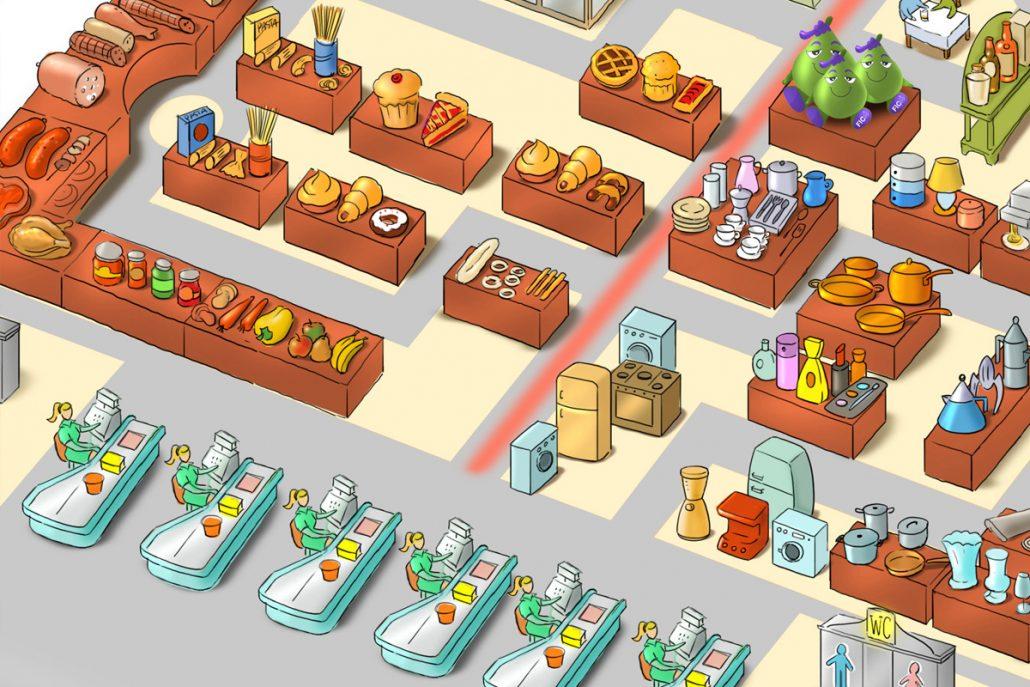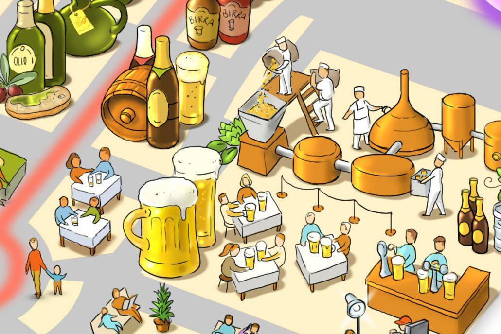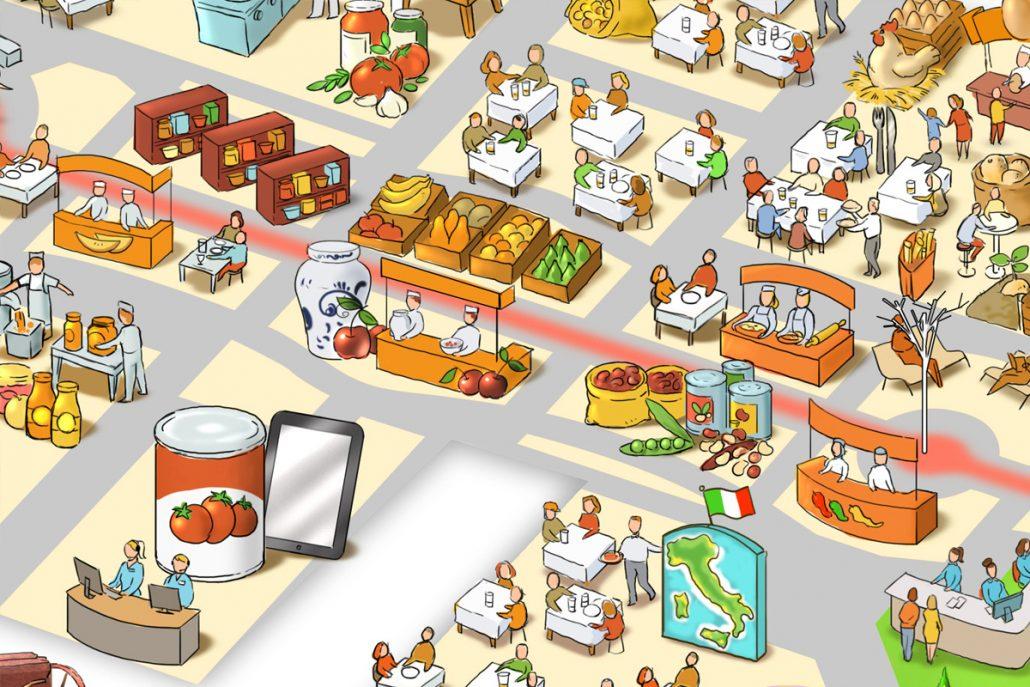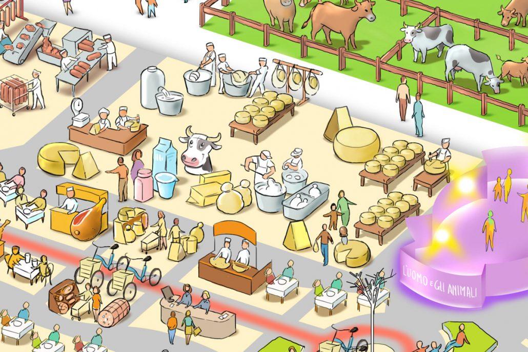 Briefing: Ideazione e realizzazione di mappa illustrata per il FICO EATALY WORLD, il più grande parco alimentare del mondo.