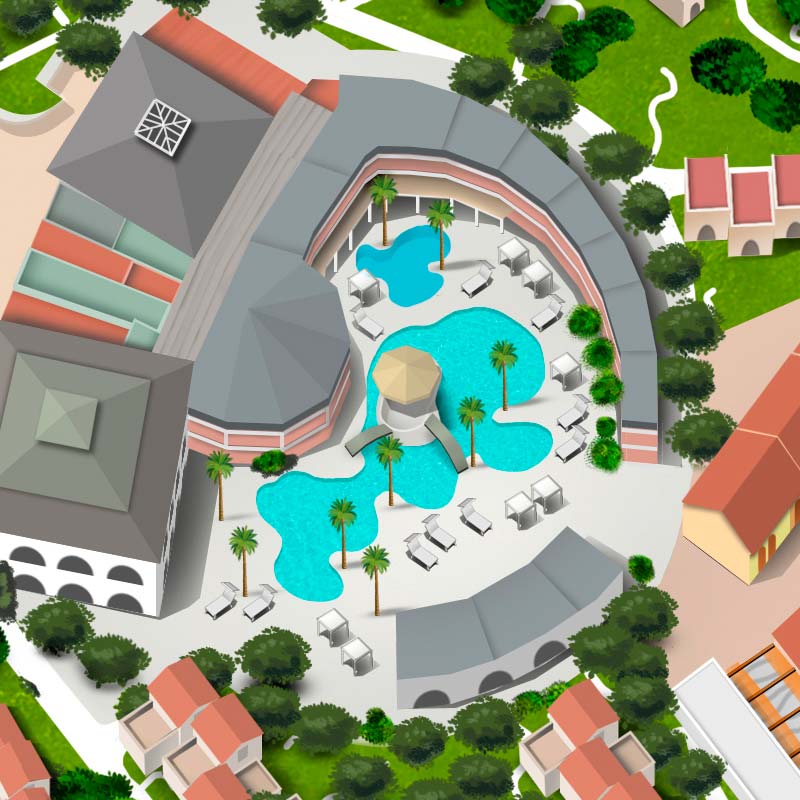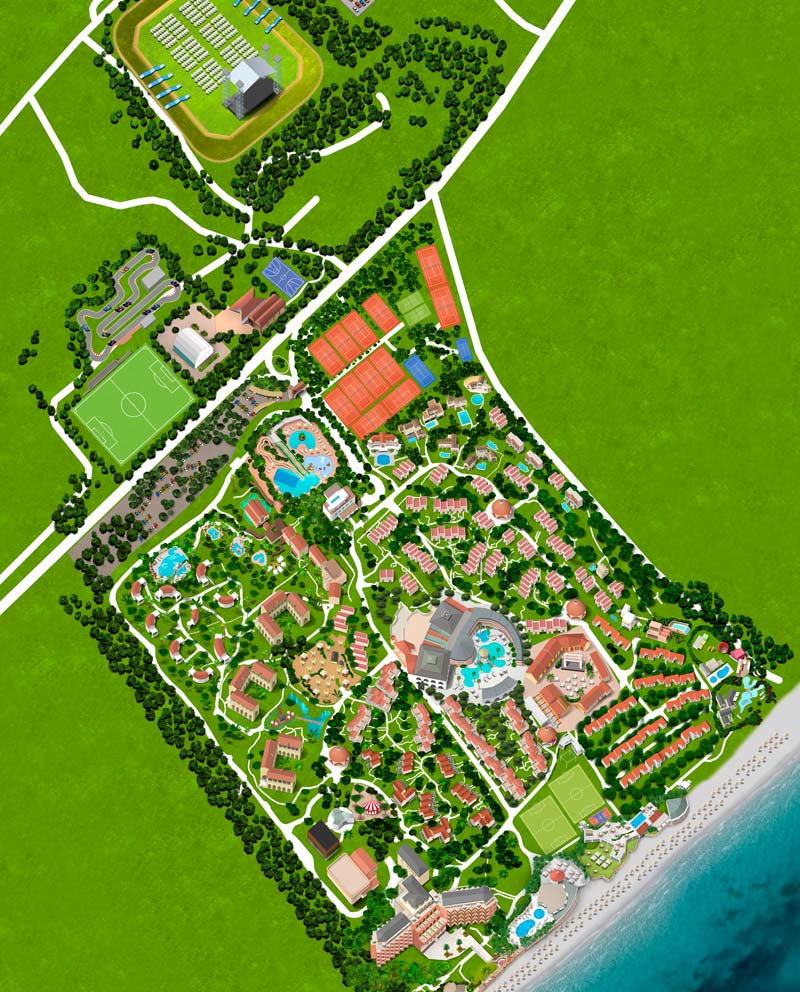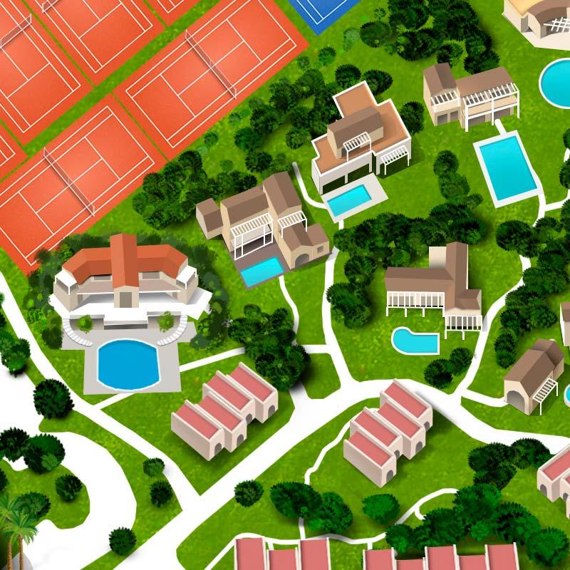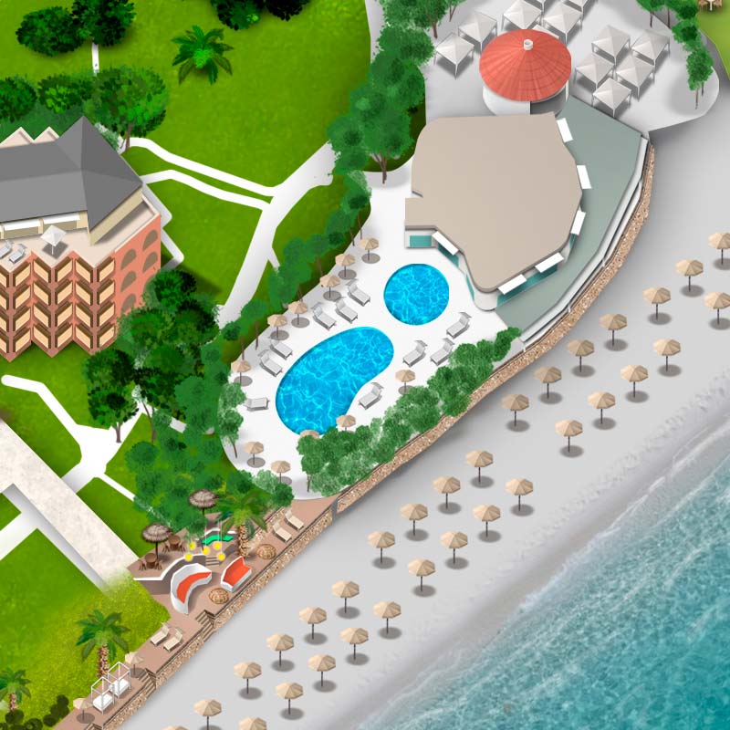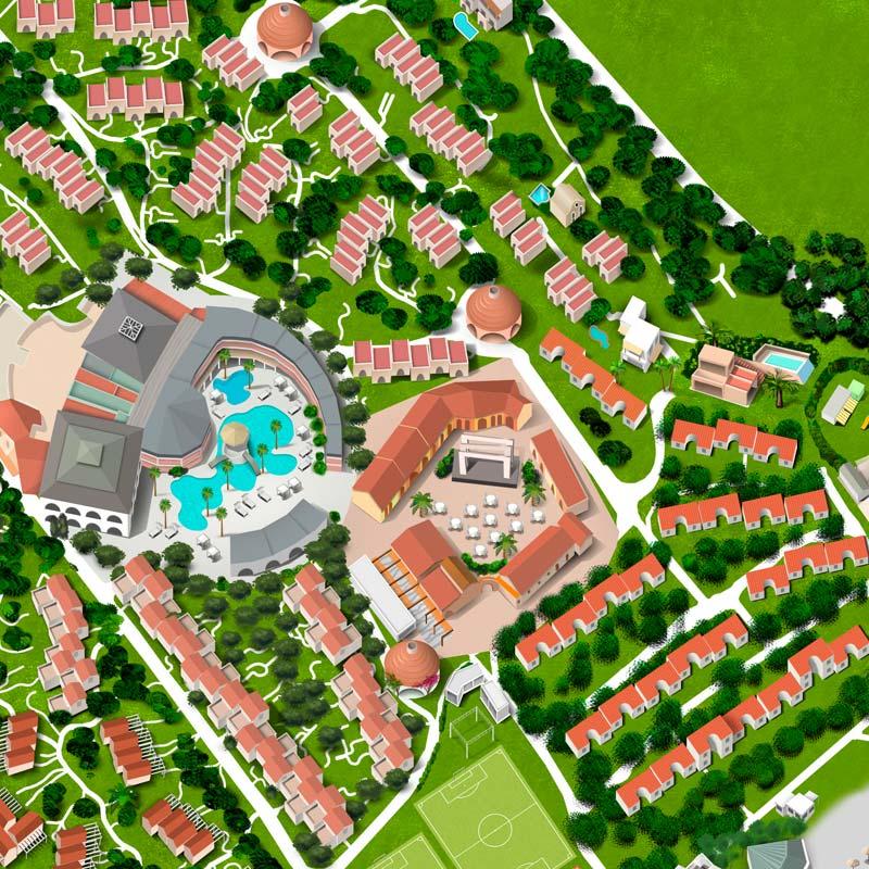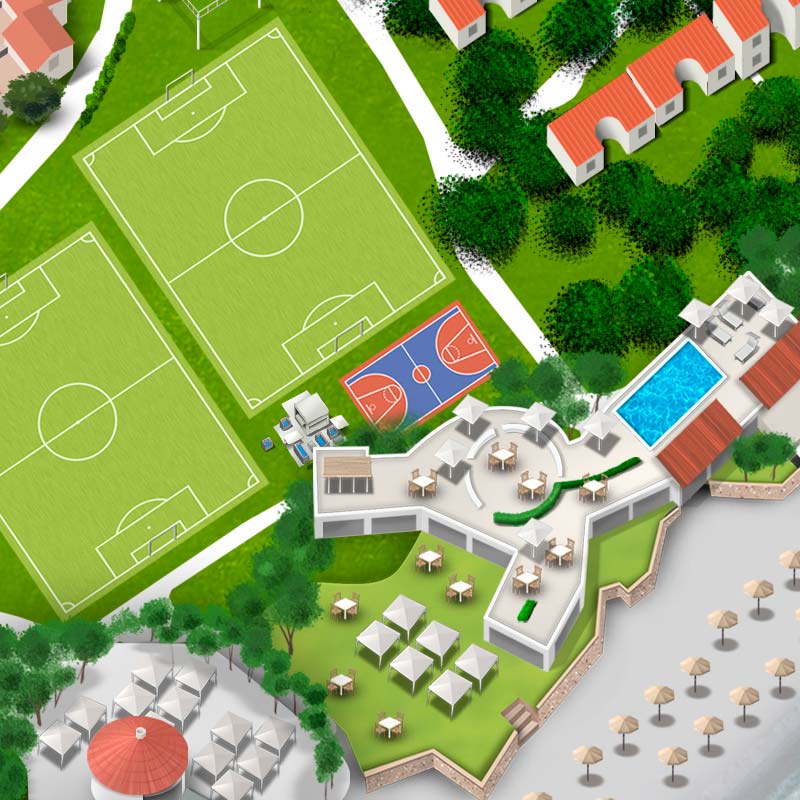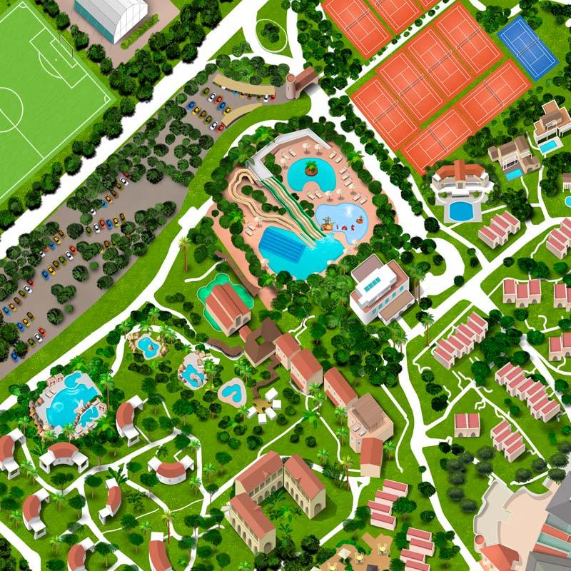 Il Forte Village Resort, situato sulla costa meridionale della Sardegna, prevede una vasta area costituita da alberghi, appartamenti e attività sia indoor che outdoor. Negozi, ristoranti, lounge bar, attività sportive e ricreative con campi da calcetto, beach volley, basket, palestra, pista da go-kart e altro nonché una vasta area dedicata a concerti e spettacoli all’aperto. Tutta l’area è immersa nel verde ed è dotata anche di una spiaggia attrezzata con lettini e ombrelloni. La produzione di questo tipo di immagine molto complessa è stata realizzata in scala quindi rispettando una planimetria esistente con una veduta zenitale. Questo tipo di richiesta ha consentito al cliente di permetterne l’integrazione con Google Maps per facilitare al turista/ospite l’orientamento e il raggiungimento delle zone desiderate, tramite l’utilizzo di App di geolocalizzazione.