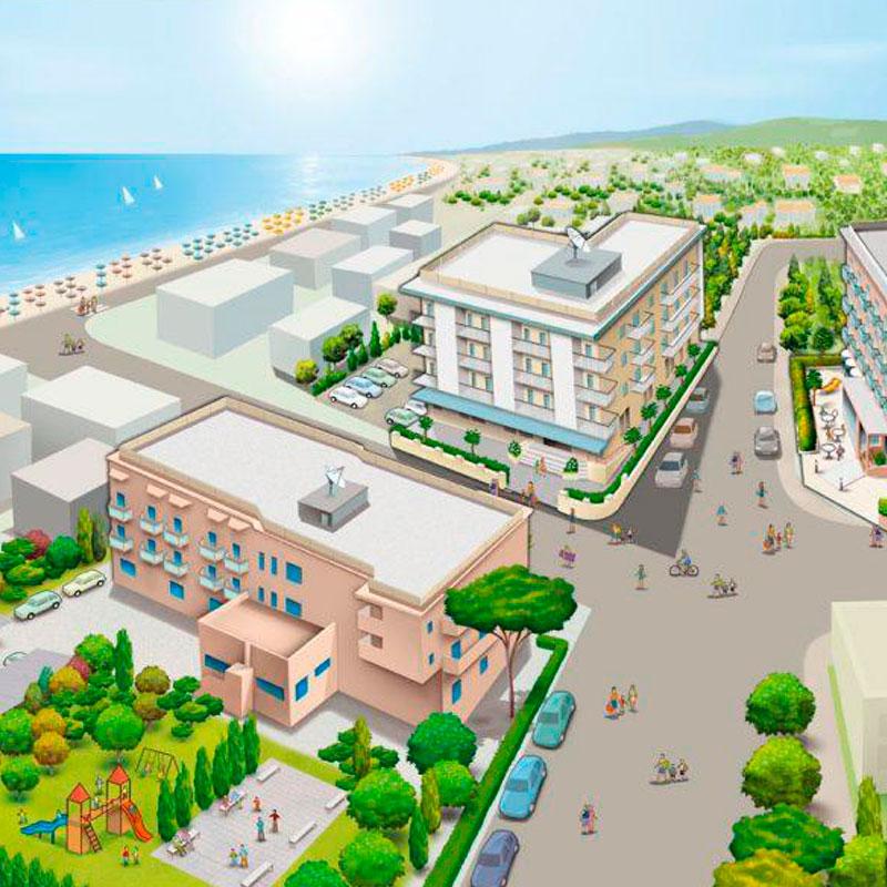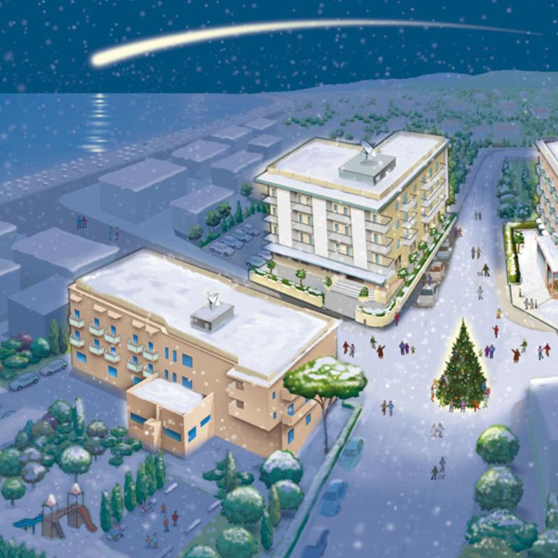 Illustrazione digitale degli Hotel Conti e Benhur di Torre Pedrera per dare una visione suggestiva e di insieme delle strutture che sorgono sul lungomare di Rimini Nord. L’illustrazione diventata icona degli Hotel fino alla realizzazione di una versione notturne e invernale usate come cartolina di auguri natalizi, grazie alle realizzazione in formato digitale che realizza ogni singolo elemento separato dal contesto, una tecnica che permette di intervenire e di apportare modifiche in tempi e a costi contenuti.
