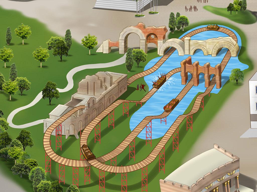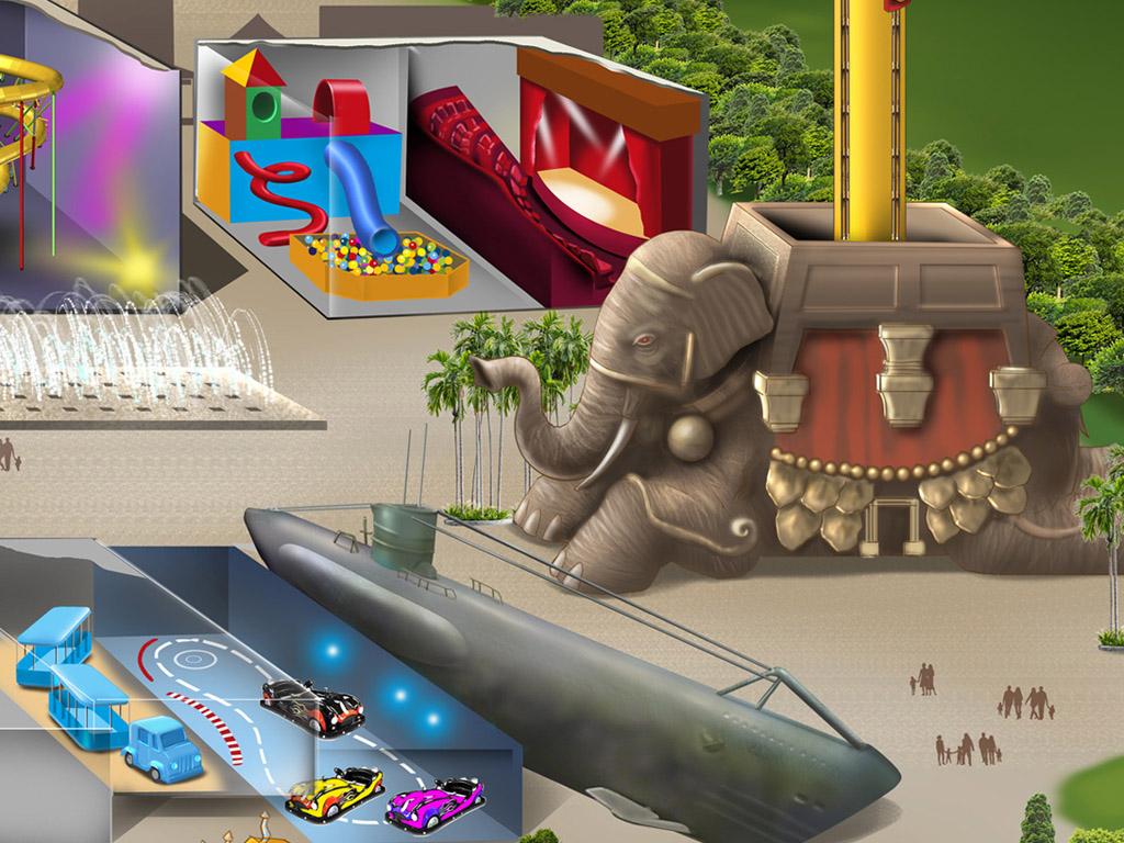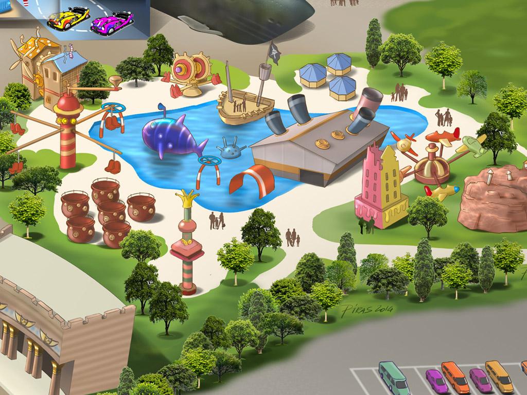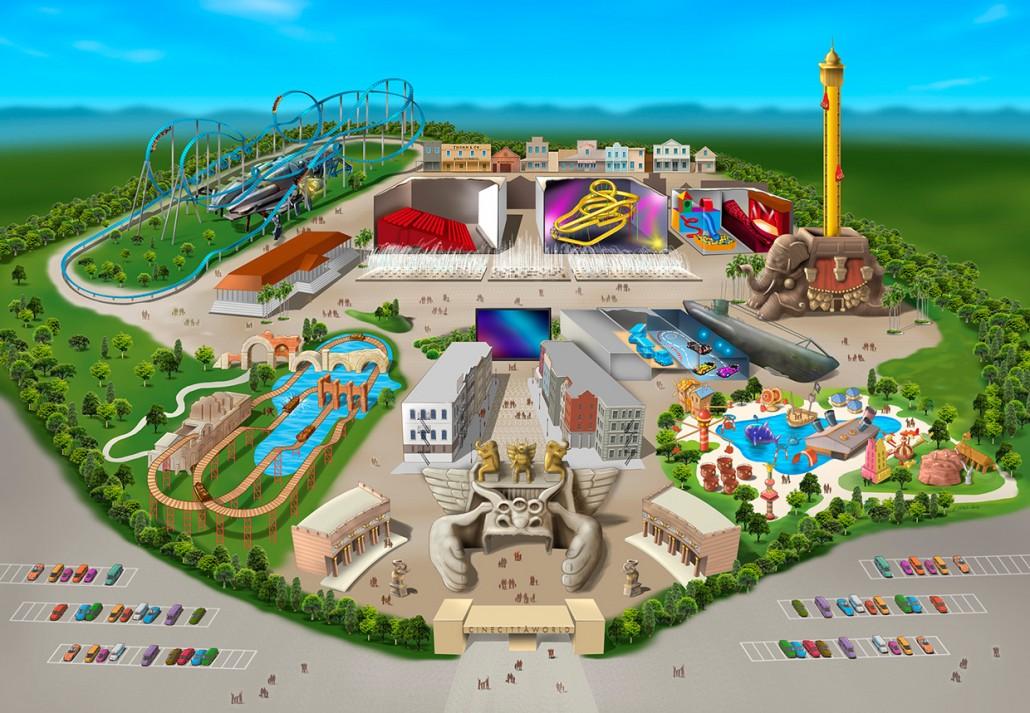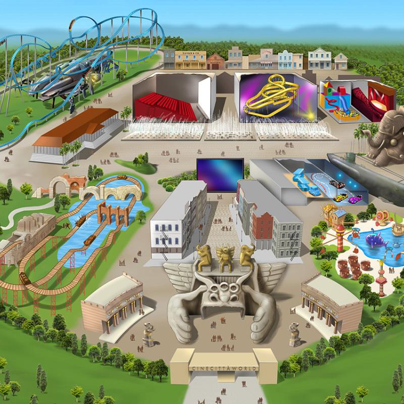 Ideazione e realizzazione di mappa illustrata per il parco divertimento a tema dedicato al mondo del Cinema di Roma. La piantina illustrata nasce con l’obiettivo di creare una illustrazione che rappresenti e orienti i visitatori tra le molteplici attrazioni del parco della storica e suggestiva location di Cinecittà e per creare un’unica immagine che sintetizzi rappresenti l’intero parco in un colpo d’occhio. Alcune attrazioni sono all’interno di strutture pertanto è stato necessario trovare escamotage per poterle illustrare.