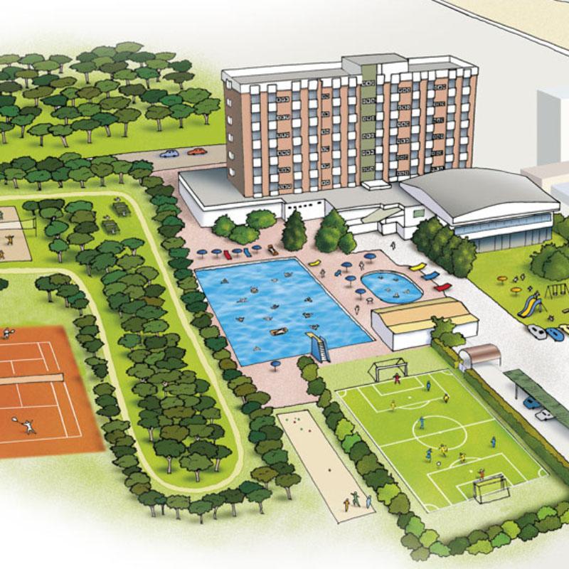 Realizzare una piantina illustrata del complesso alberghiero del Punta Nord a Torre Pedrera di Rimini, che possa rappresentare in maniera sintetica ed immediata tutta l’ampia area a disposizione dei clienti, la struttura, le sue opportunità, gli impianti sportivi, i servizi dell’Hotel. La mappa è realizzata in formato digitale, tenendo ogni singolo elemento separata dal contesto; una tecnica che permette di intervenire in caso di necessità di apportare modifiche a strutture o intervenire su altri dettagli.
