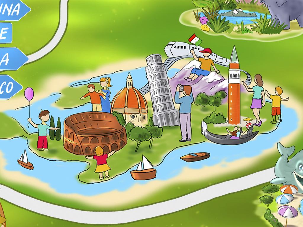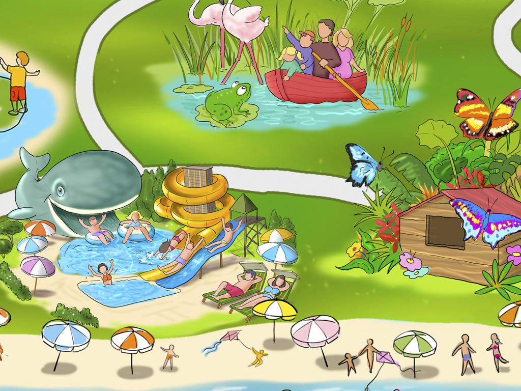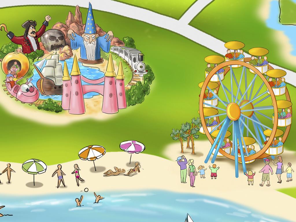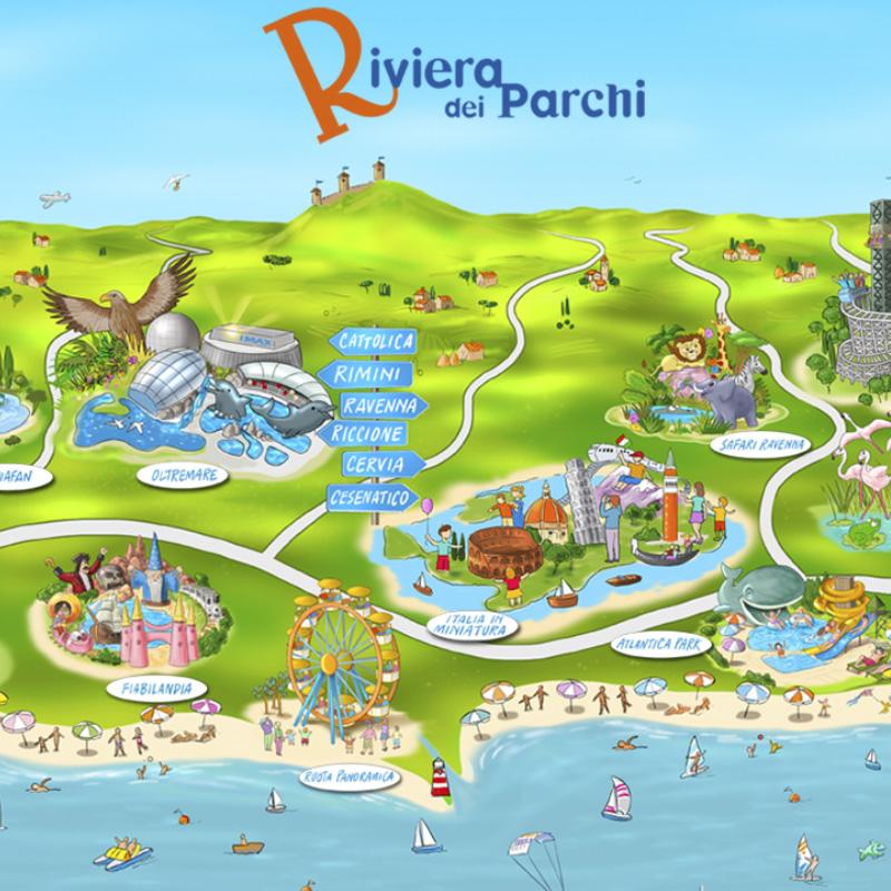 Realizzare una piantina illustrata che rappresentasse in maniera sintetica ed immediata tutti i parchi tematici della Rivera Romagnola facendoli diventare protagonisti come punti di attrazione di tutto il territorio della provincie di Rimini e Ravenna con vista dal mare verso l’interno. Utilizzata come immagine iconografica del consorzio per il sito web, le brochure, le campagne pubblicitarie , le campagne stampa e affissioni, contenuto visuale per i post sui social media.
