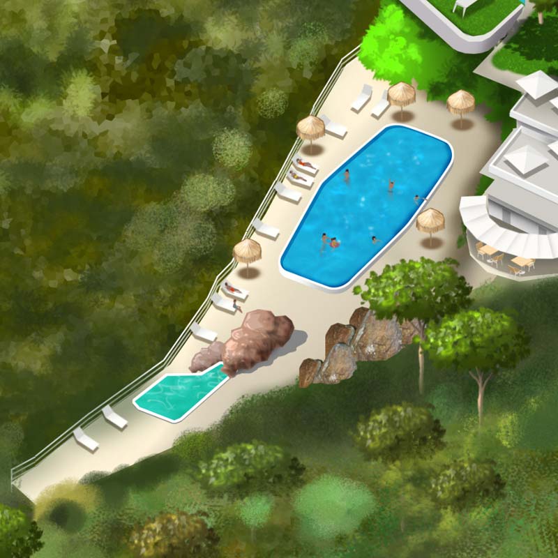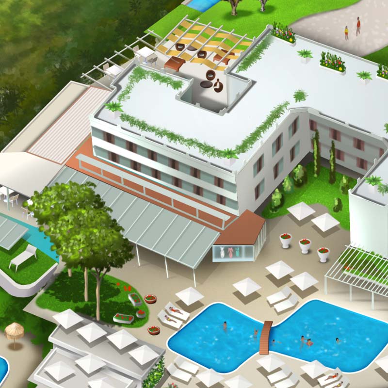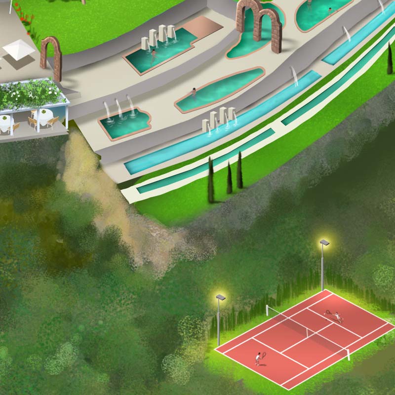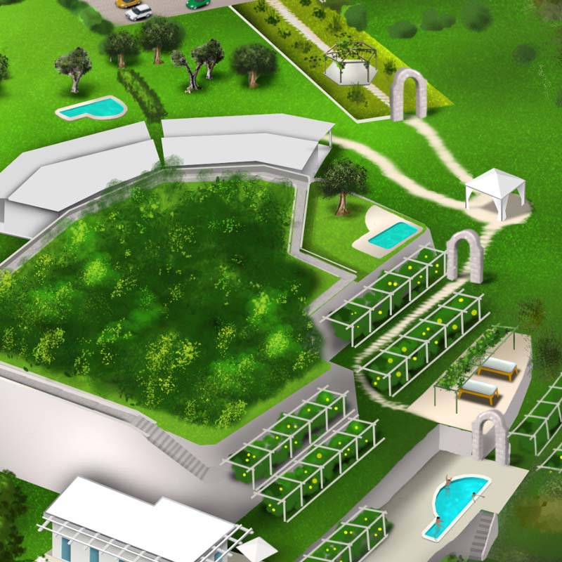 Realizzare una mappa / piantina illustrata del Resort & SPA di San Montano a Ischia che possa dare una vista immediata di tutta la struttura nel suo complesso. I percorsi, gli orti e giardini, i giochi d’acqua, le piscine, i gazebo, i ristoranti, le opportunità di svago e i punti di attrazione nel dettaglio per orientare i clienti e dare una visione di insieme di San Montano Resort & SPA, Hotel 5 Stelle a Ischia. L’illustrazione è realizzata in formato digitale, tenendo ogni singolo elemento separata dal contesto; una tecnica che permette di intervenire in caso di necessità di modifiche aggiungendo o eliminando punti di interesse e attrazioni.