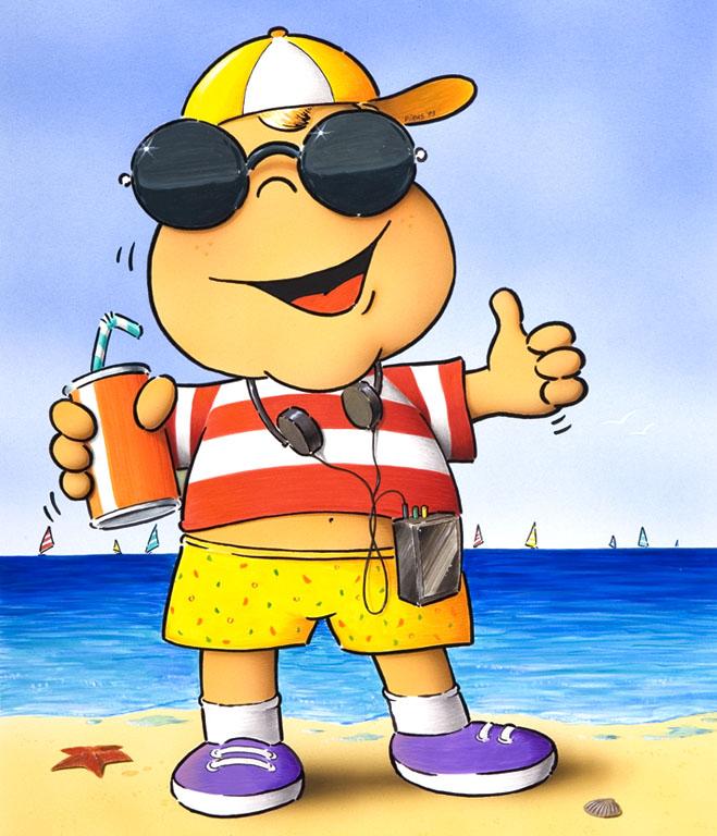 Siamo nei primi anni ’90 a Rimini e per una ricerca di mercato legata al settore turistico, nasce l’esigenza di trovare un’immagine solare, simpatica, di impatto e che occupi con tutta la sua forza cromatica quasi tutta la superficie del manifesto pubblicitario che verrà stampato di lì a poco. Dal briefing ricevuto, decidiamo di dr vita a questo personaggio: il Pasqualotto. L’utilizzo del computer e della creazione delle immagini digitali deve attendere ancora qualche anno per cui l’illustrazione viene realizzata ad aerografo e acrilici su cartoncino. Si tratta di un’immagine vintage diventata una icona / mascotte del Consorzio che promuove la ricerca di mercato legata al turismo, e che ritrae un simpatico turista sorridente con occhialini da sole dal design anni ’80, maglietta a righe su pantaloncini fantasia stile Najoleari, berretto, bibita e Walkman. Utilizzato per campagna affissioni e copertina materiale divulgativo.