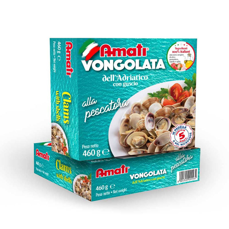 Creare un progetto grafico per valorizzare il pack dei prodotti Vongolata dell’adriatico con guscio alla pescatora e Vongole al pomodoro.