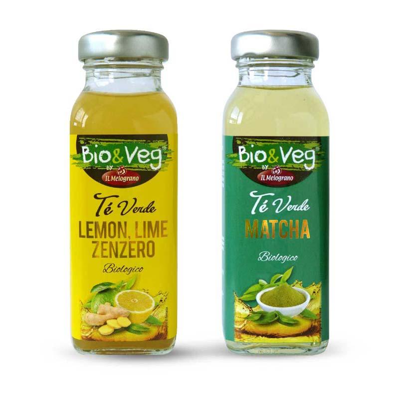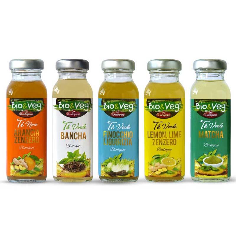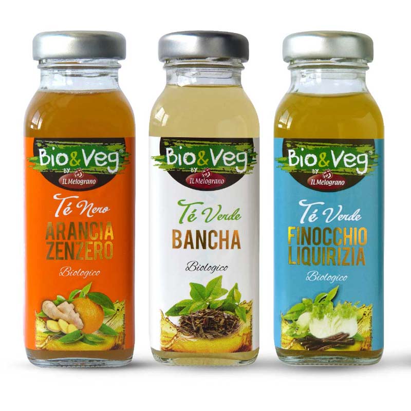 Linea di tè marchiati Bio&Veg, il brand per caratterizzare la linea di prodotti biologici e vegani da noi creato per l’azienda Il Melograno di Santarcangelo di Romagna. Obiettivo: creare un packaging su una bottiglietta in vetro dalla silhouette originale, una etichetta in carta impreziosita con stampa a caldo / effetto specchio su alcuni particolari e immagini fotografiche degli ingredienti su fondini in diverse tonalità di colore per indicare visivamente e immediatamente il gusto e creare una continuità e una immagine coordinata di linea.